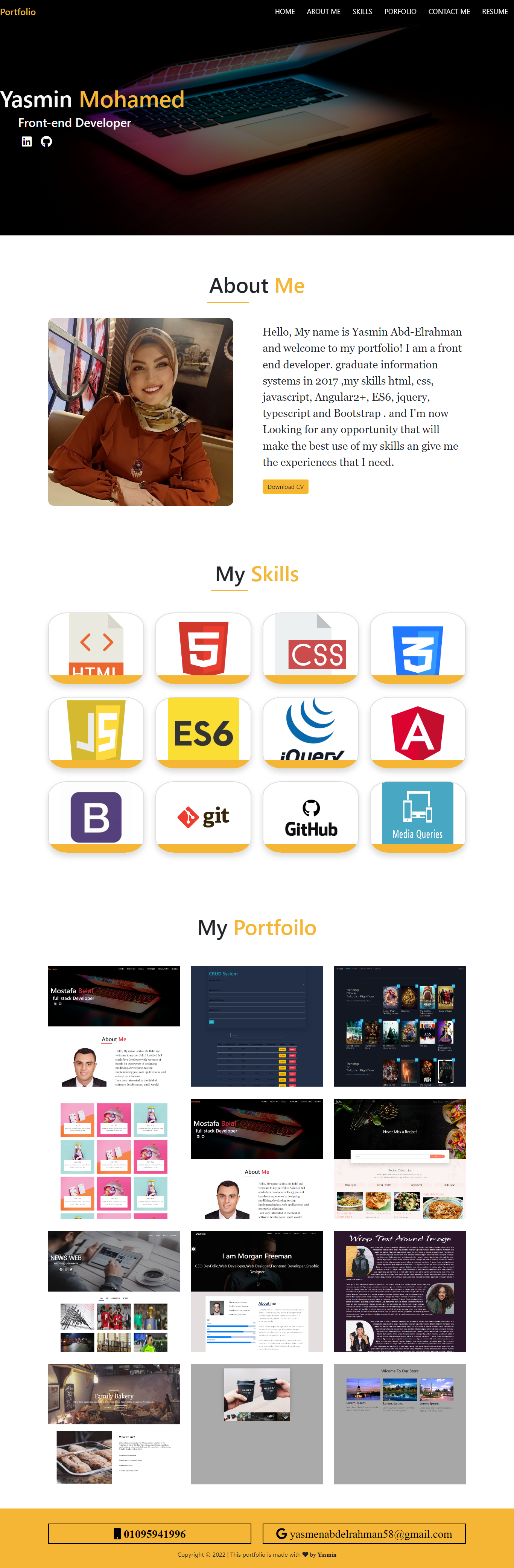 Hello, My name is Yasmin Abd-Elrahman and welcome to my portfolio! I am a front end developer. graduate information systems in 2017 ,my skills html, css, javascript, Angular2+, ES6, jquery, typescript and Bootstrap .